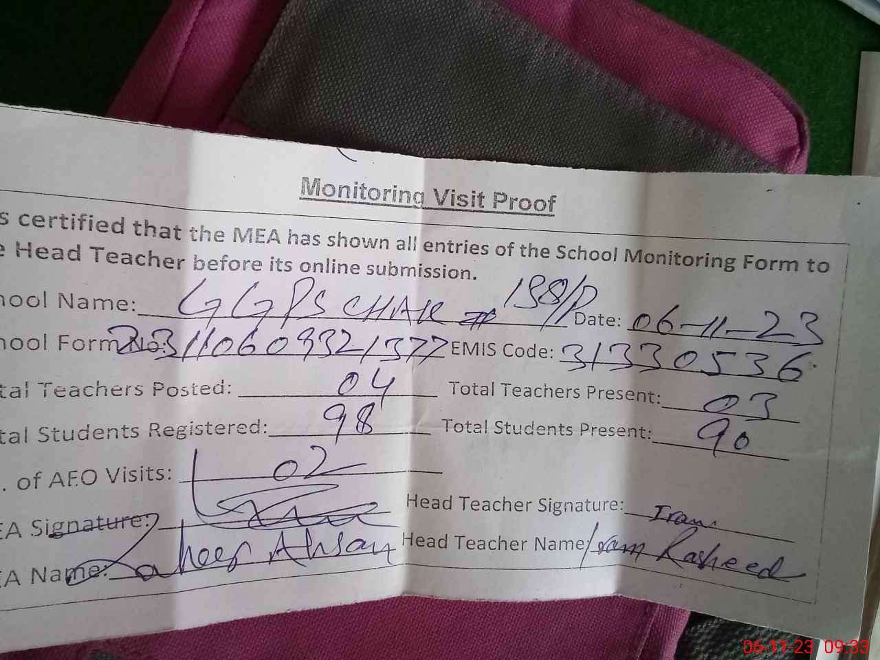 | Attendance Register | Head Teacher | MEA with School | Visit Proof |