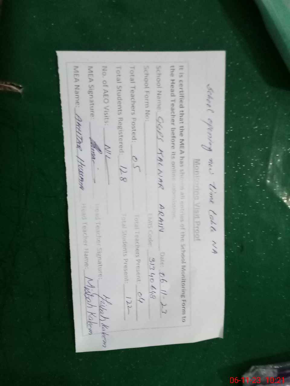 | Attendance Register | Head Teacher | MEA with School | Visit Proof |