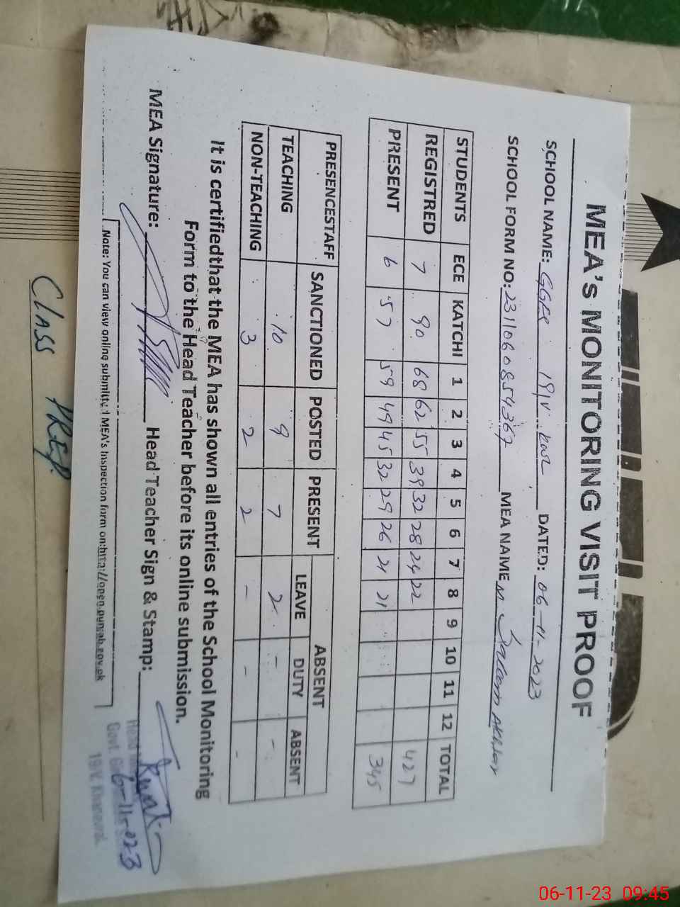 | Attendance Register | Head Teacher | MEA with School | Visit Proof |