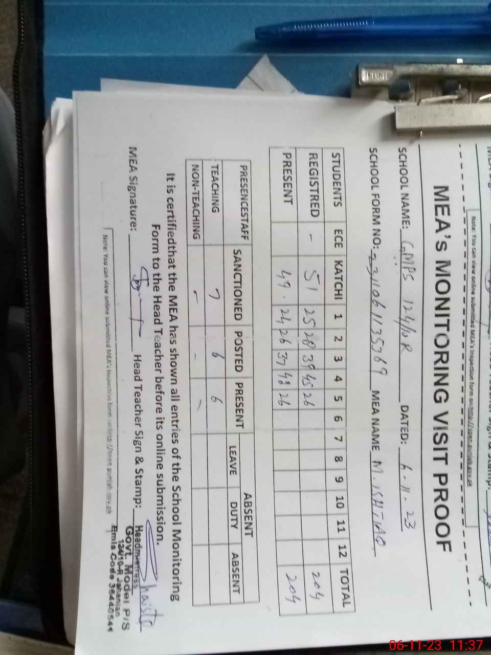 | Monitoring Date: 06-11-2023 | Start Time: 06-11-2023 10:55 AM | End Time: 06-11-2023 11:53 AM | Name of MEA: M.Is**** (S**** 03**** | |