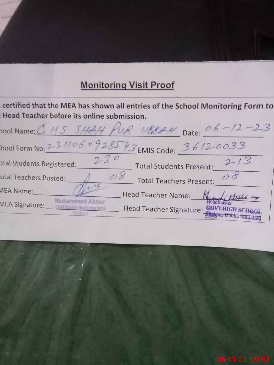 | Attendance Register | Head Teacher | MEA with School | Visit Proof |