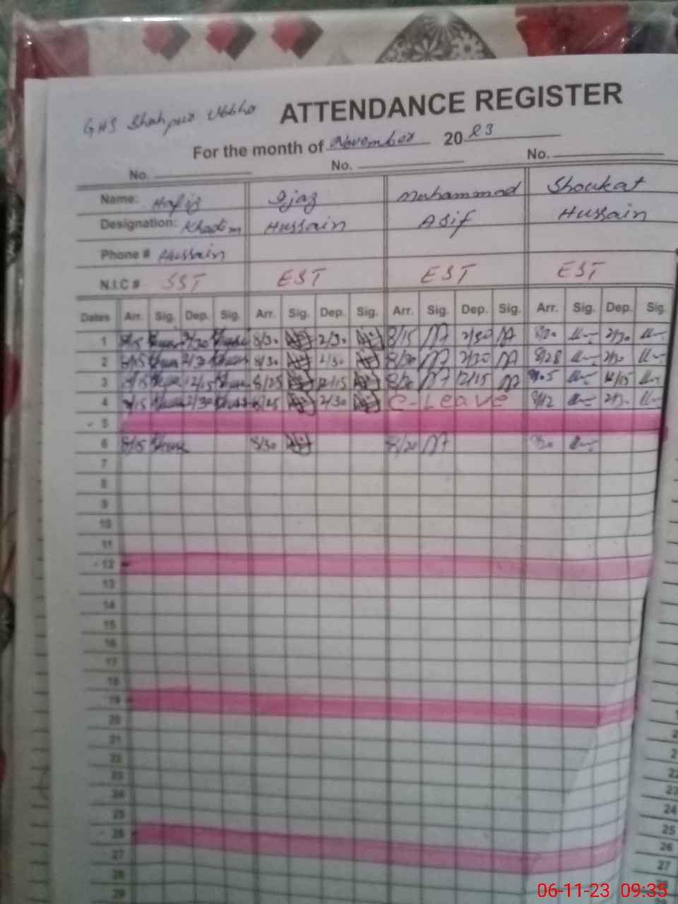| CNIC | Full Name | Designation | R/C | Absence During Last Calender Month |