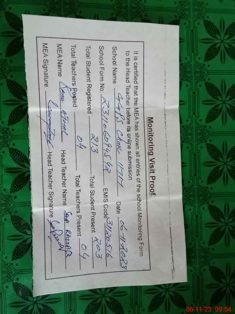 | EMIS Code: 31120516 | Name of School: GGPS CHAK NO. 117 MURAD | |||