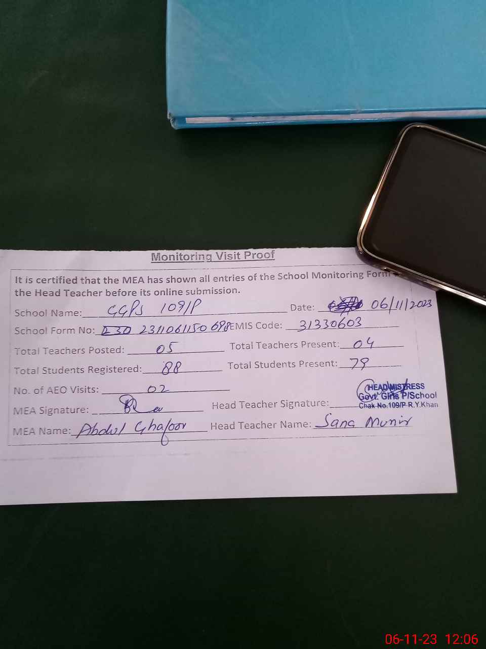 | Attendance Register | Head Teacher | MEA with School | Visit Proof |