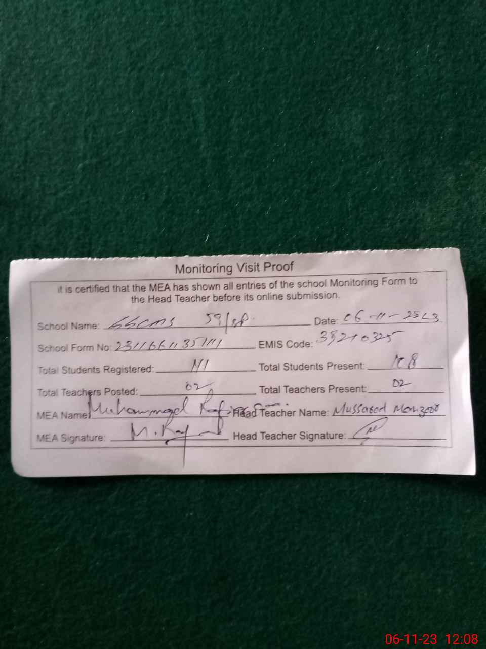 | Attendance Register | Head Teacher | MEA with School | Visit Proof |