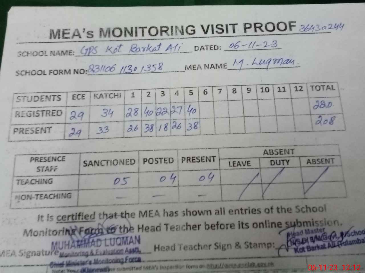 | Attendance Register | Head Teacher | MEA with School | Visit Proof |