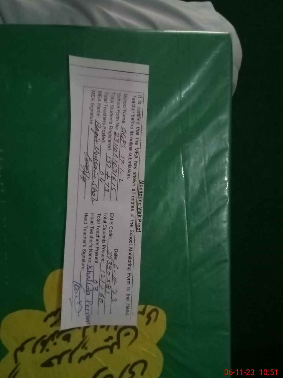 | Attendance Register | Head Teacher | MEA with School | Visit Proof |