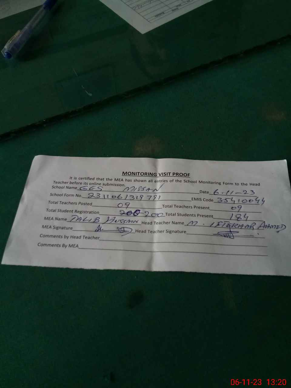 | Attendance Register | Head Teacher | MEA with School | Visit Proof |