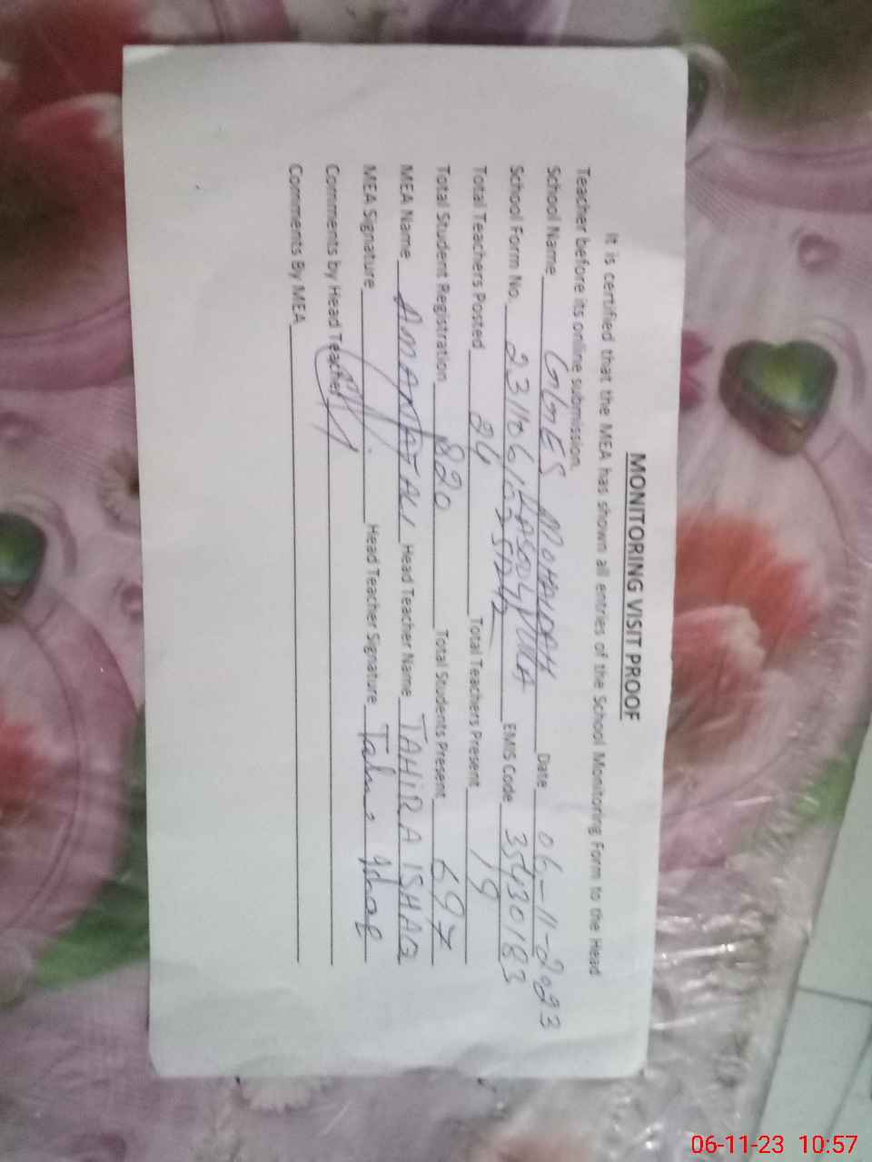 | Attendance Register | Head Teacher | MEA with School | Visit Proof |