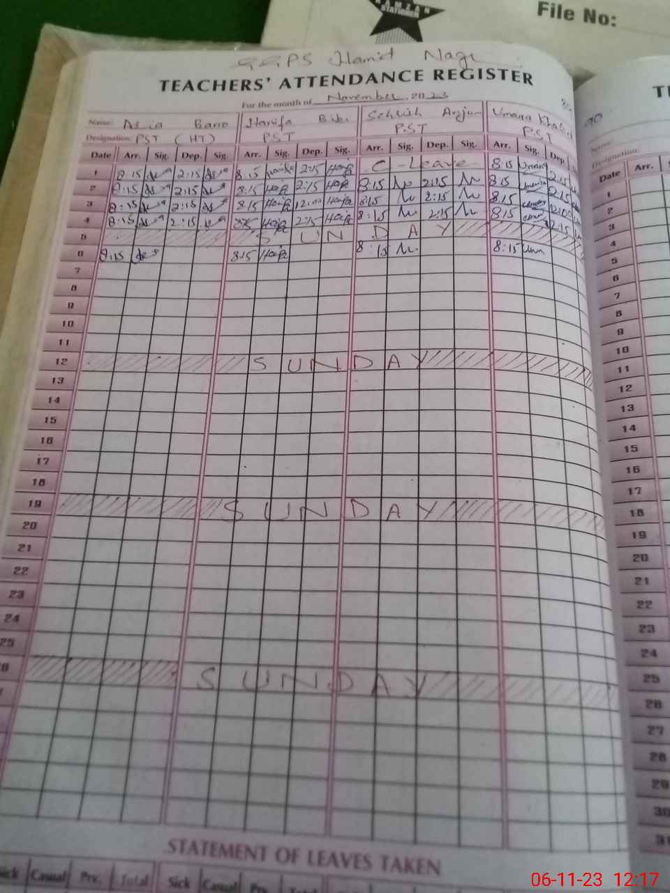 | CNIC | Full Name | Designation | R/C | Absence During Last Calender Month |