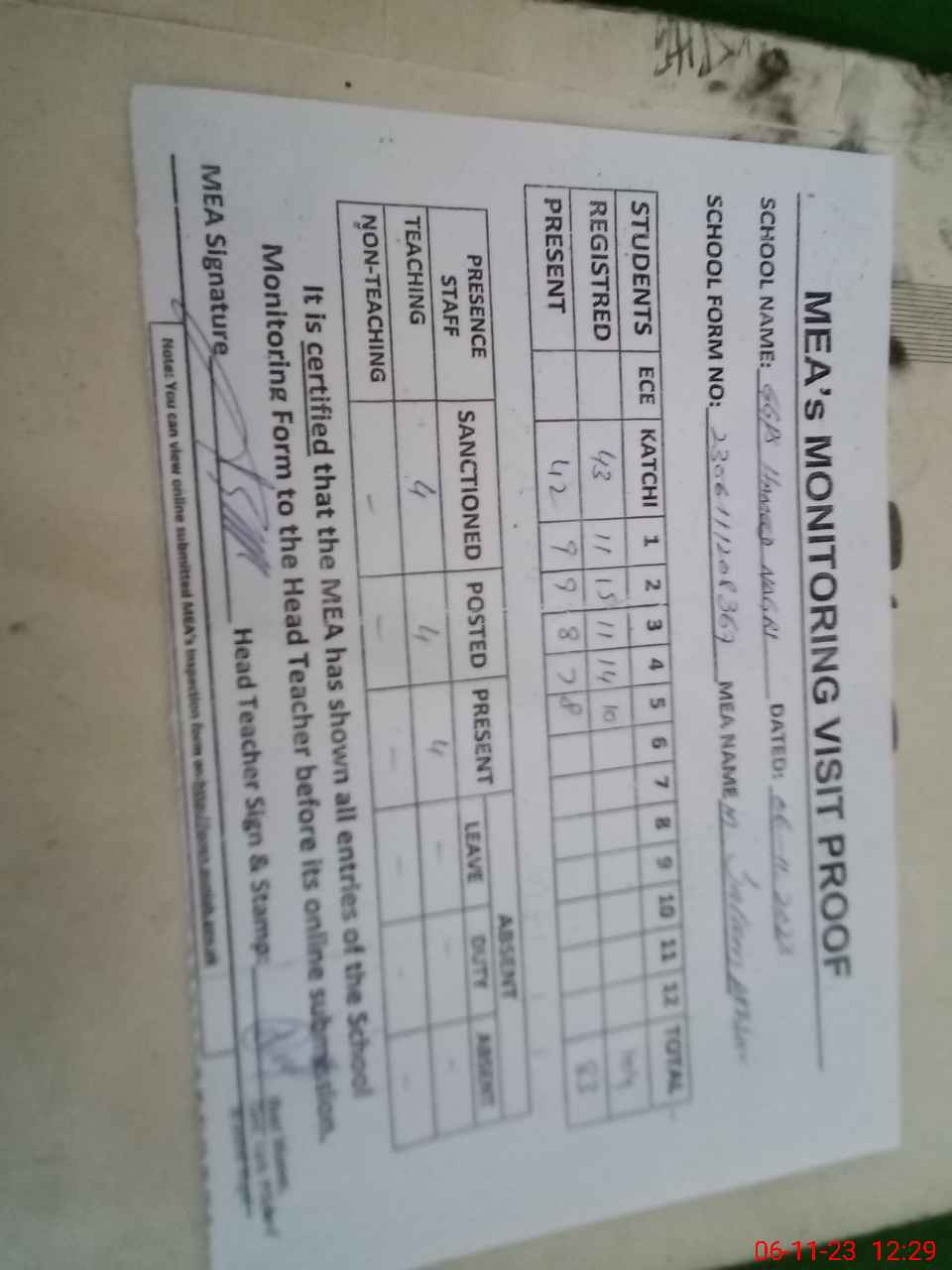 | Attendance Register | Head Teacher | MEA with School | Visit Proof |