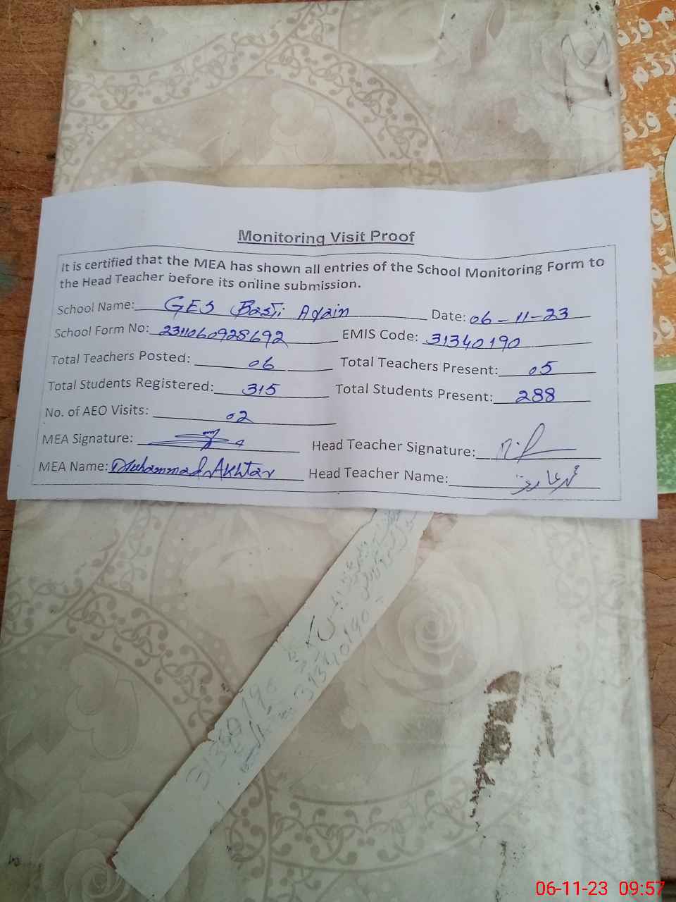 | EMIS Code: 31340190 | Name of School: GES BASTI ARAIN | |||