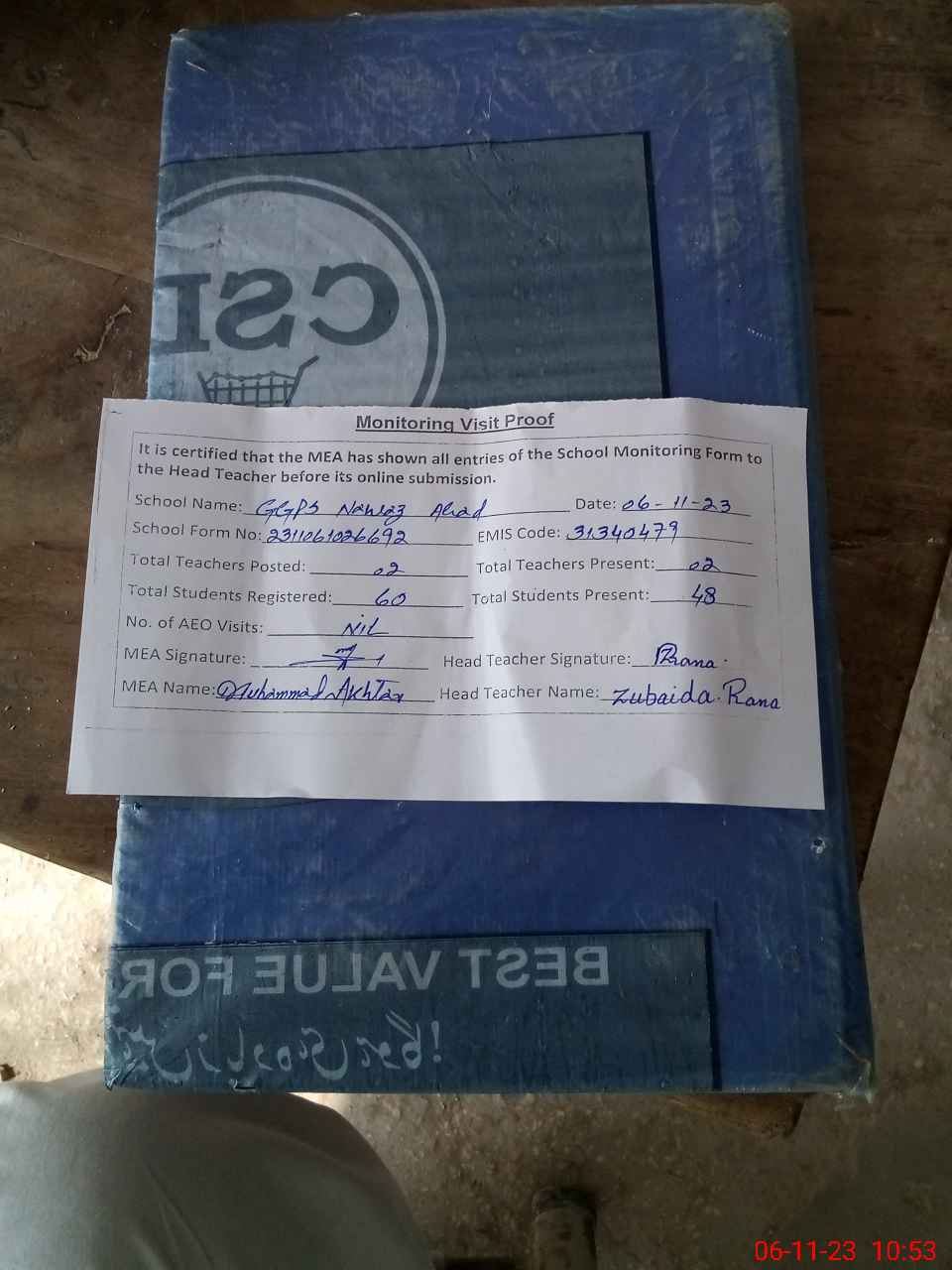 | Remarks (Use Separate Page if Required): NSB bank statement not available in school at time of visit mea School tab is not working Two toilet non functional due to water not available in toilet Electricity non functional The Head teacher Kg class faq attends register put the mea | |||||