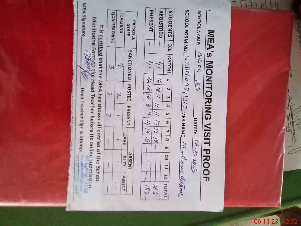 | Attendance Register | Head Teacher | MEA with School | Visit Proof |
