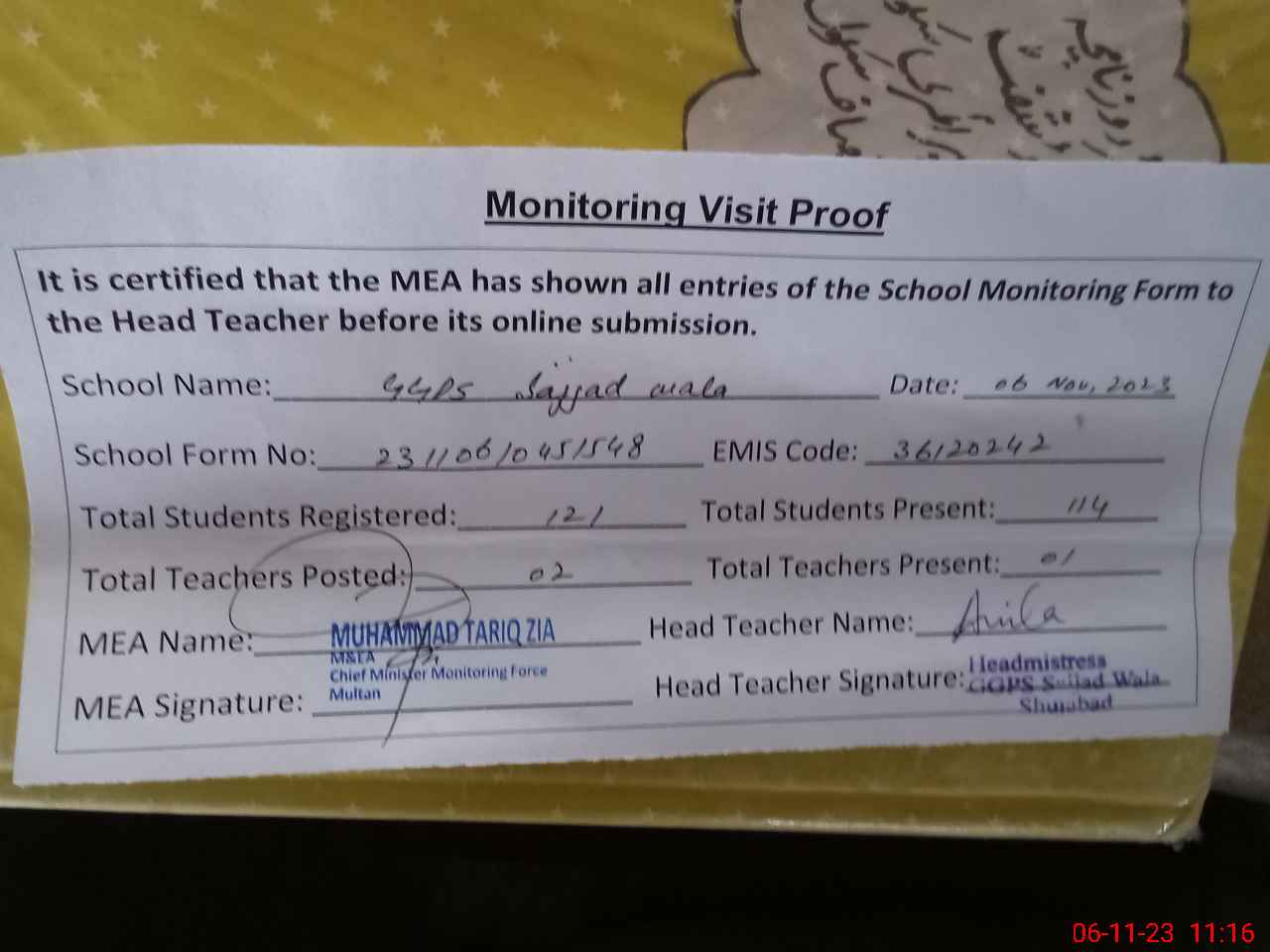 | Attendance Register | Head Teacher | MEA with School | Visit Proof |