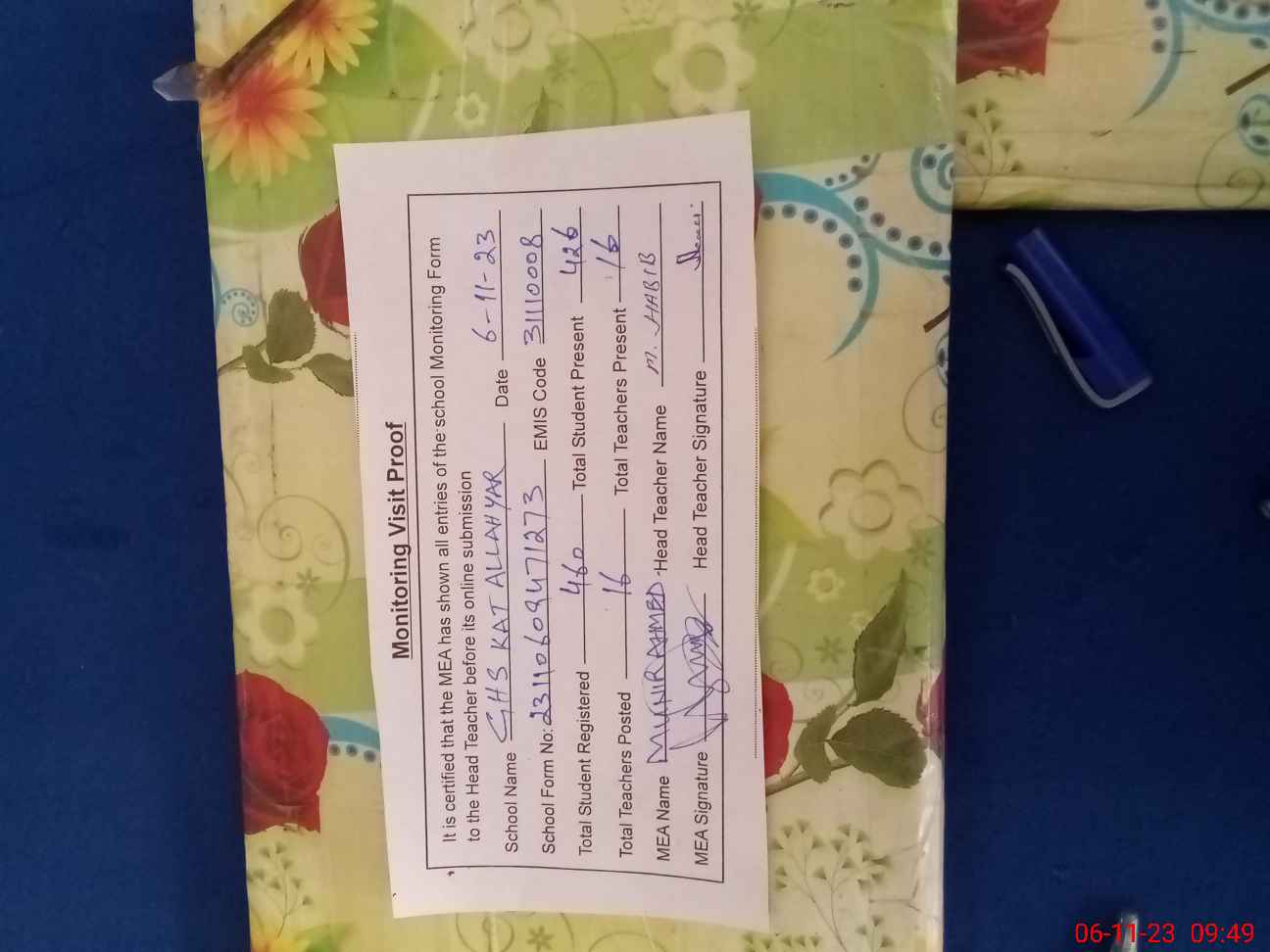 | Attendance Register | Head Teacher | MEA with School | Visit Proof |