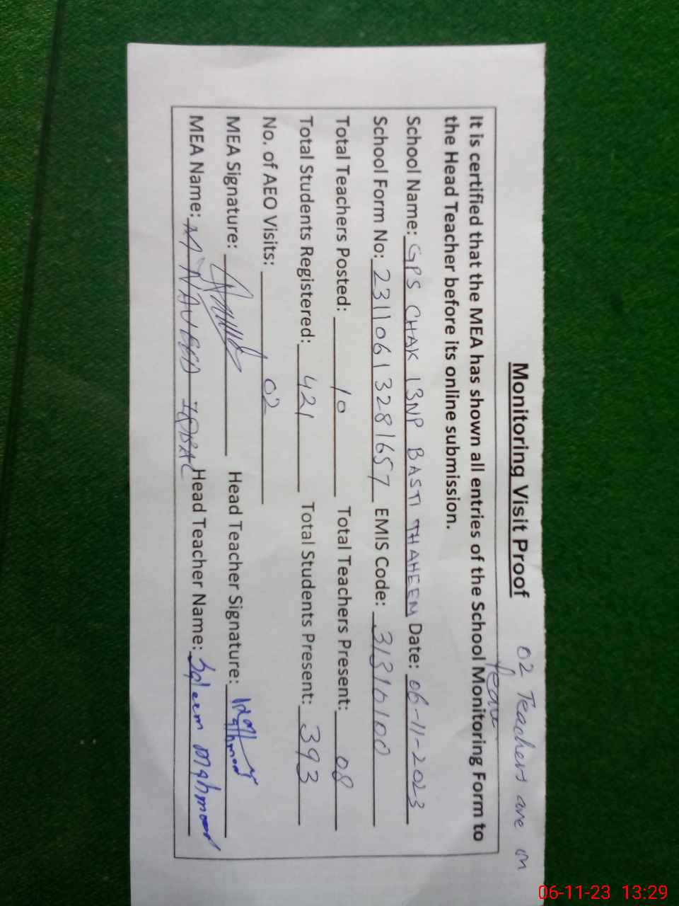 | Attendance Register | Head Teacher | MEA with School | Visit Proof |