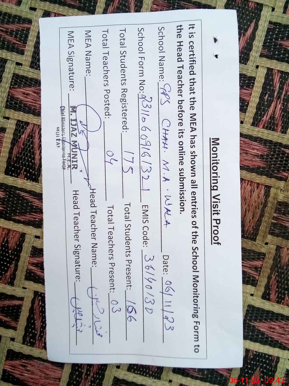 | Attendance Register | Head Teacher | MEA with School | Visit Proof |
