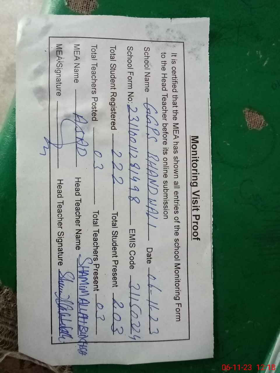 | Attendance Register | Head Teacher | MEA with School | Visit Proof |