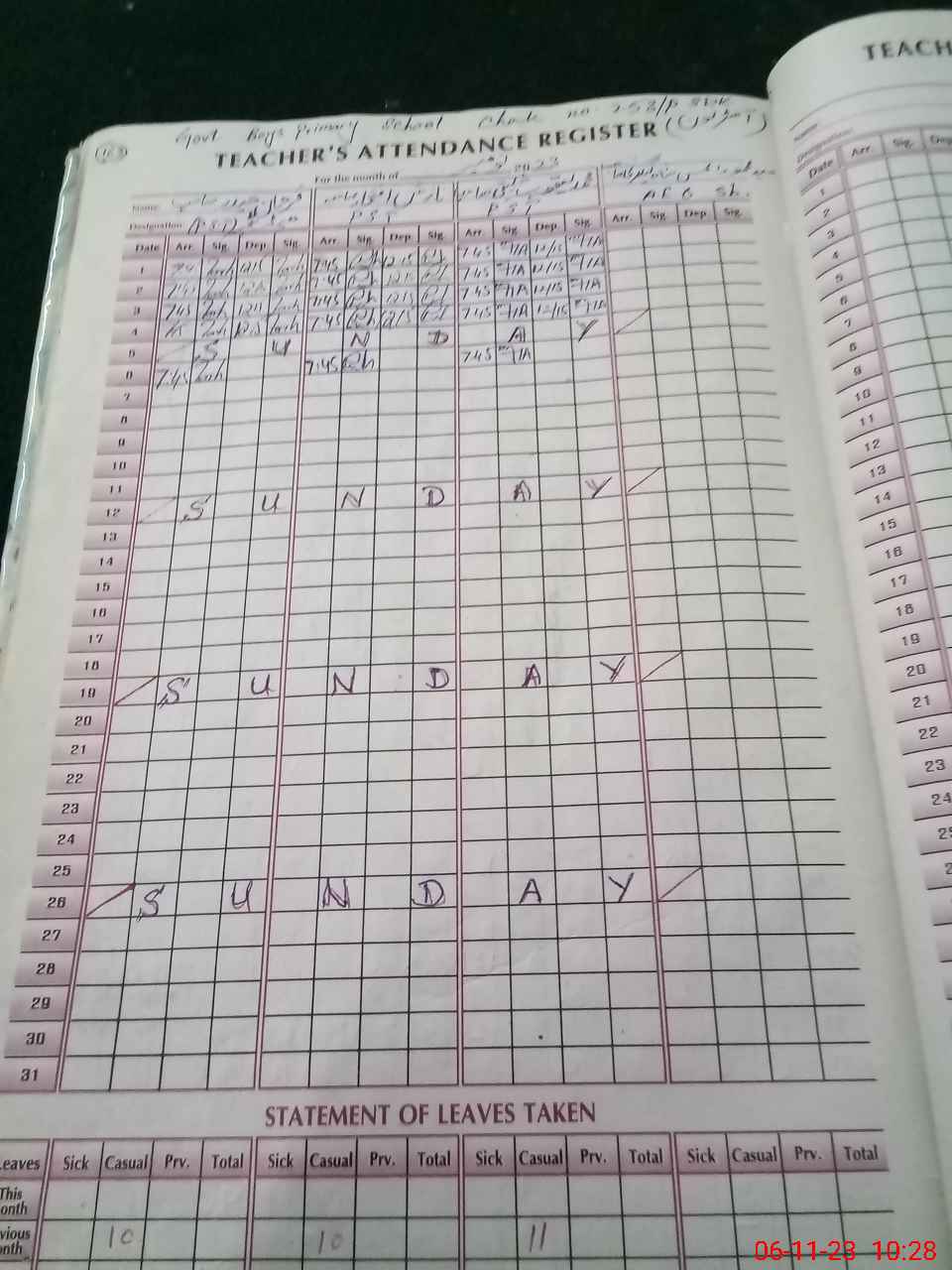 | No. of Students Present - Male | 0 | 0 | 0 | 0 | 0 | 0 | 8 | 12 | 11 | 0 | 0 | 31 | ||||