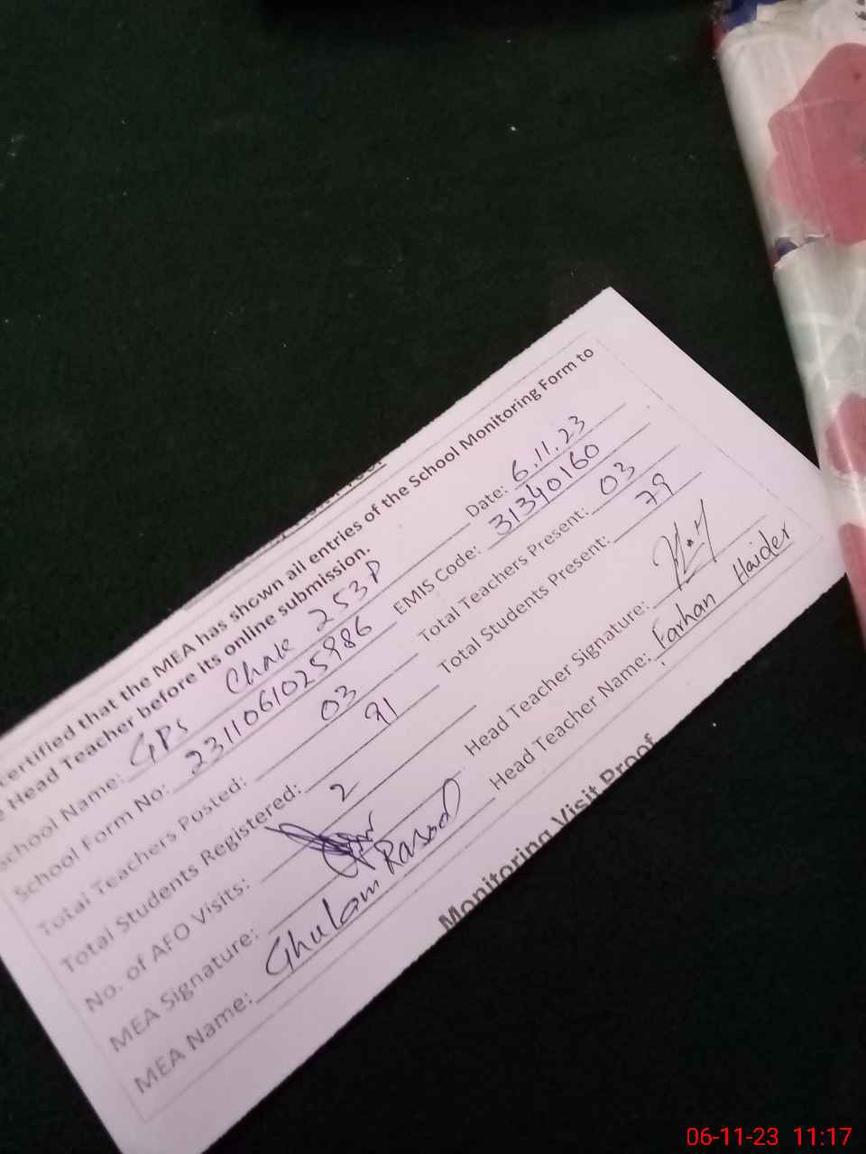 | Monitoring Date: 06-11-2023 | Start Time: 06-11-2023 10:25 AM | End Time: 06-11-2023 11:17 AM | Name of MEA: Gh**** Ra**** | |