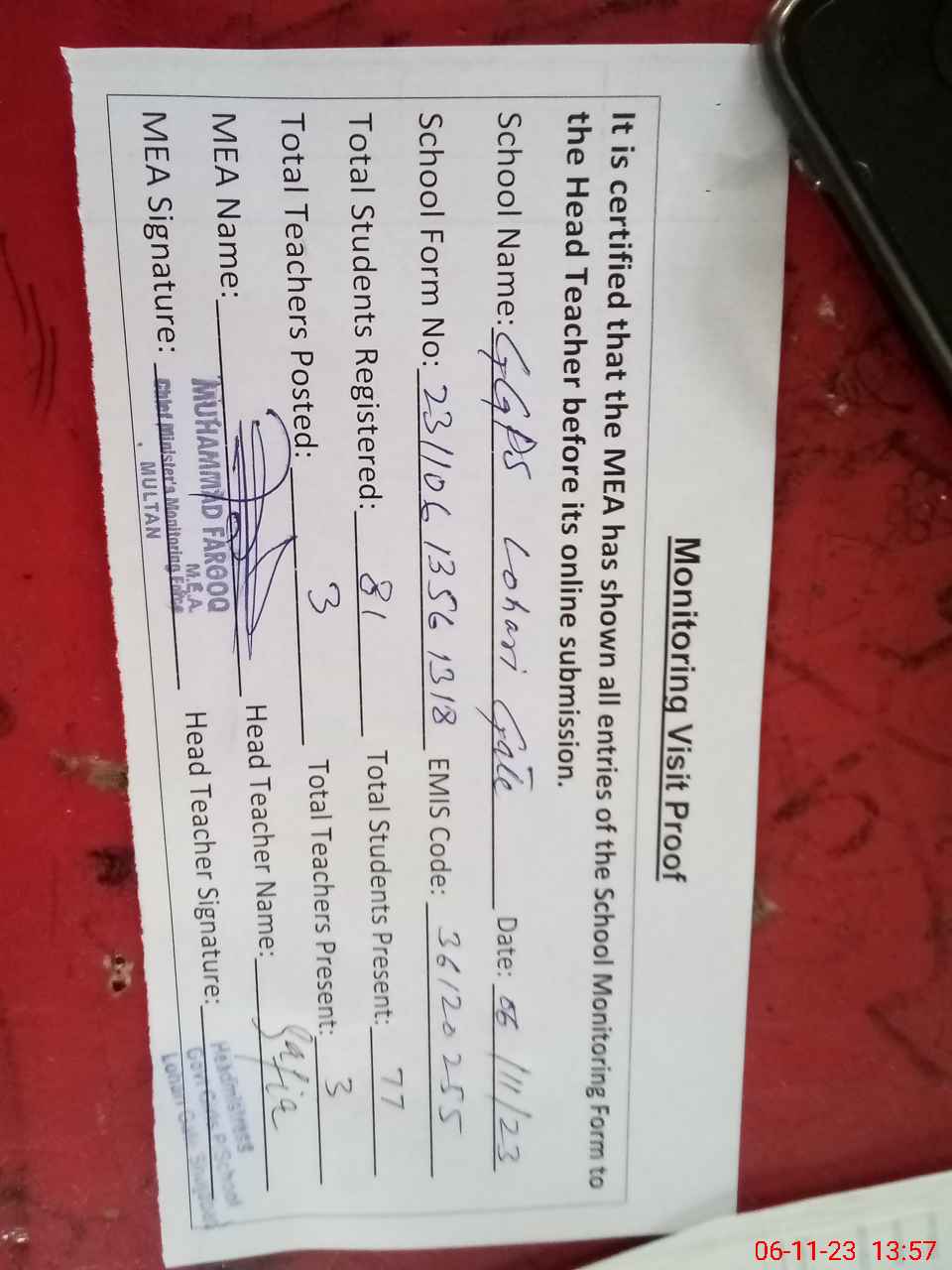 | Attendance Register | Head Teacher | MEA with School | Visit Proof |