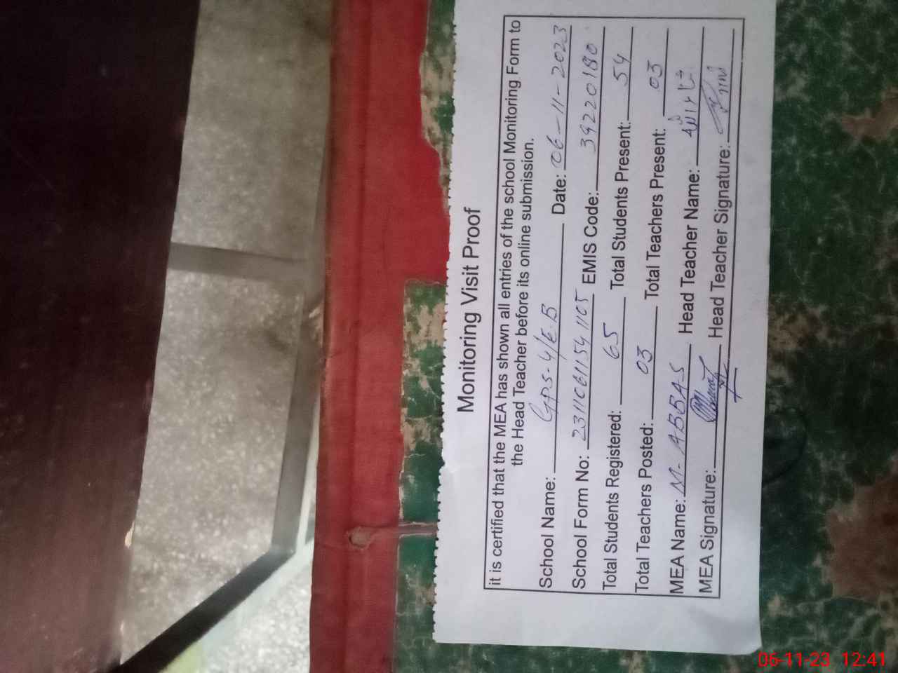 | Attendance Register | Head Teacher | MEA with School | Visit Proof |