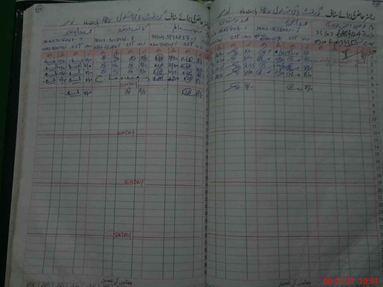 | CNIC | Full Name | Designation | R/C | Absence During Last Calender Month |