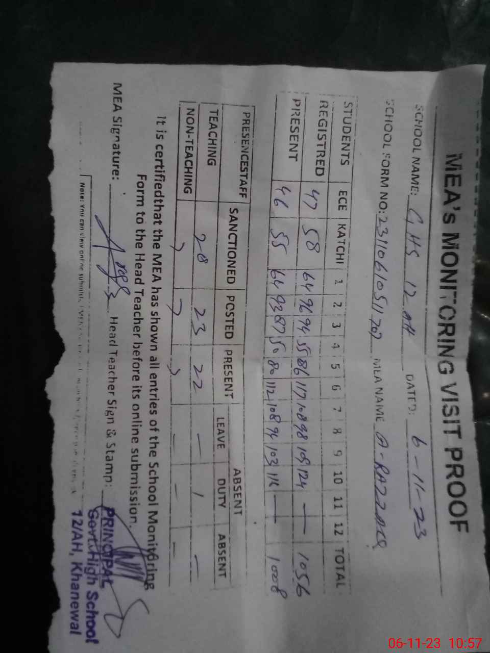 | Attendance Register | Head Teacher | MEA with School | Visit Proof |