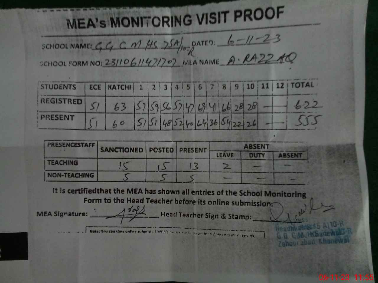 | Attendance Register | Head Teacher | MEA with School | Visit Proof |