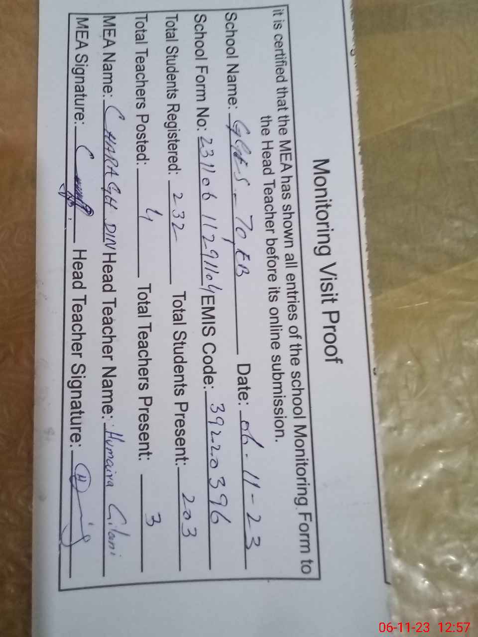 | Attendance Register | Head Teacher | MEA with School | Visit Proof |