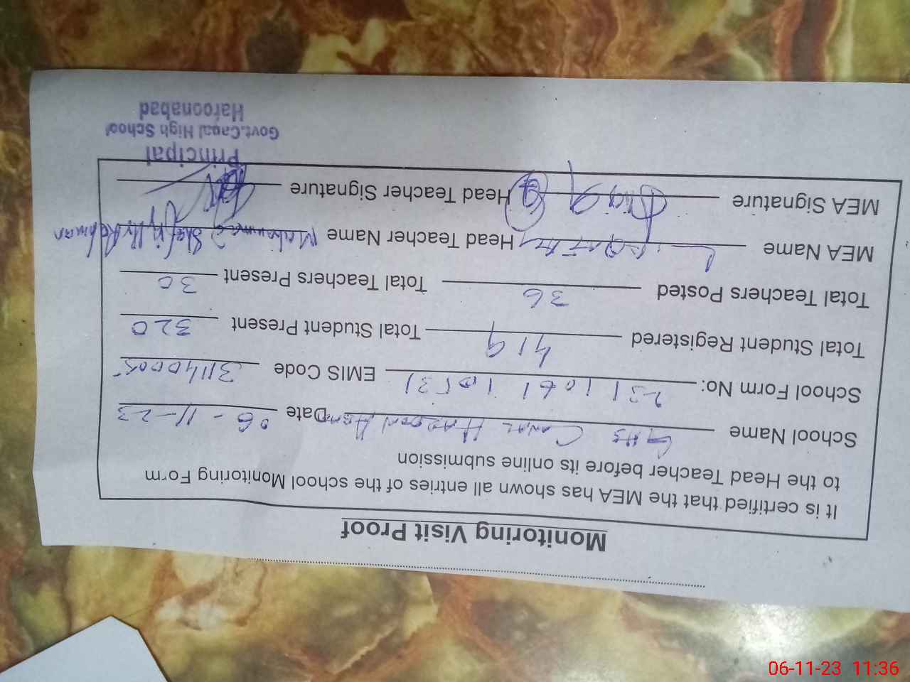 | Attendance Register | Head Teacher | MEA with School | Visit Proof |
