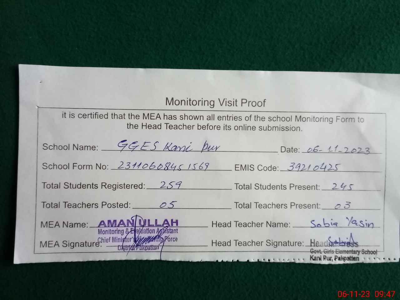 | Attendance Register | Head Teacher | MEA with School | Visit Proof |