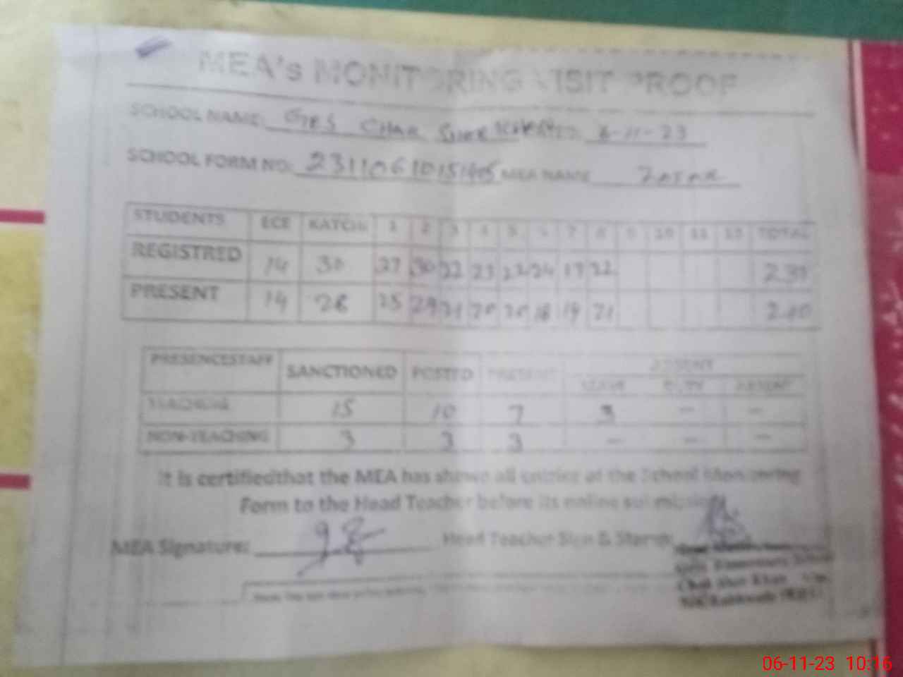 | Attendance Register | Head Teacher | MEA with School | Visit Proof |