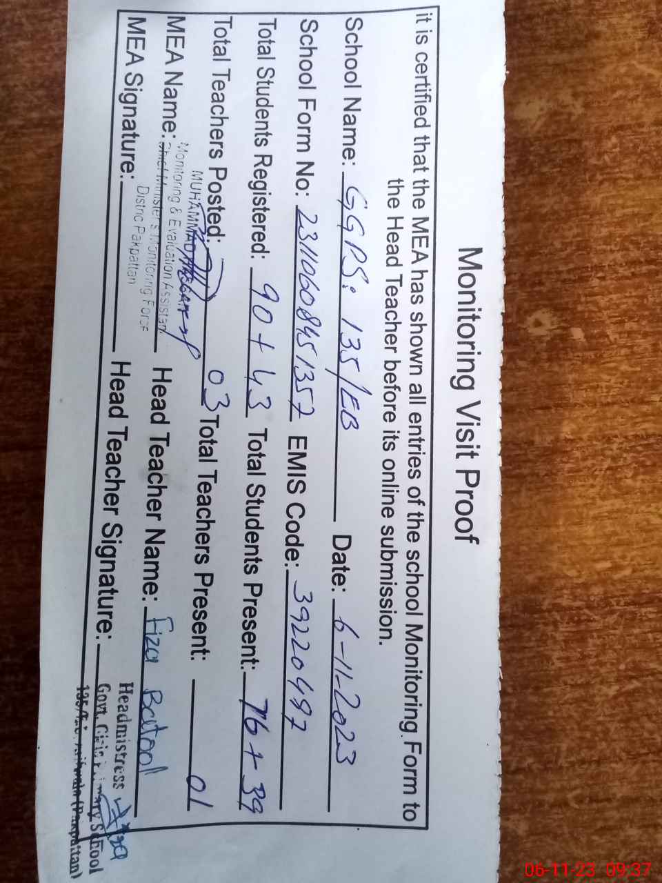 | Attendance Register | Head Teacher | MEA with School | Visit Proof |