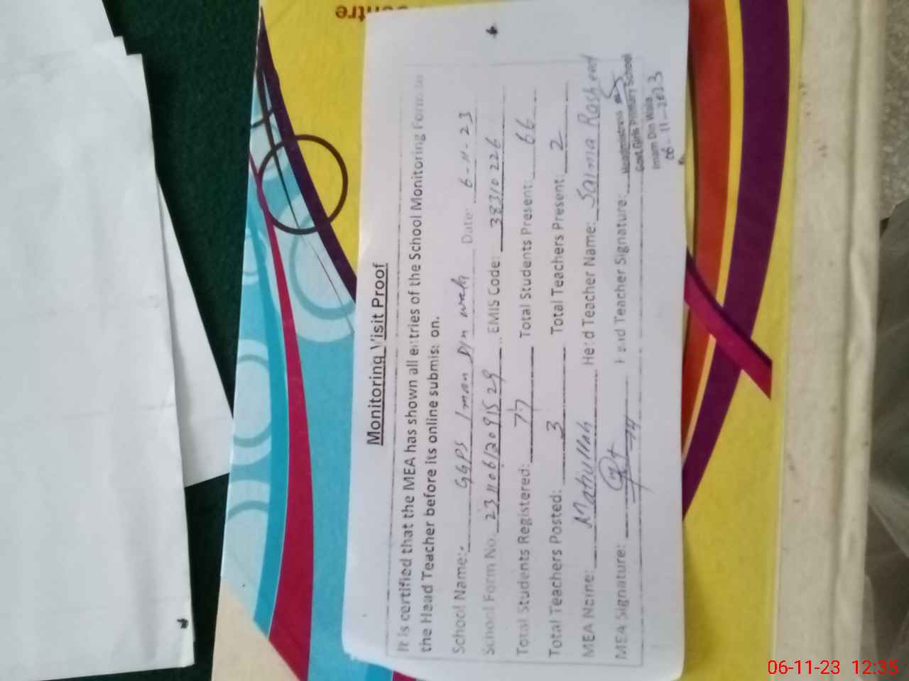 | Attendance Register | Head Teacher | MEA with School | Visit Proof |