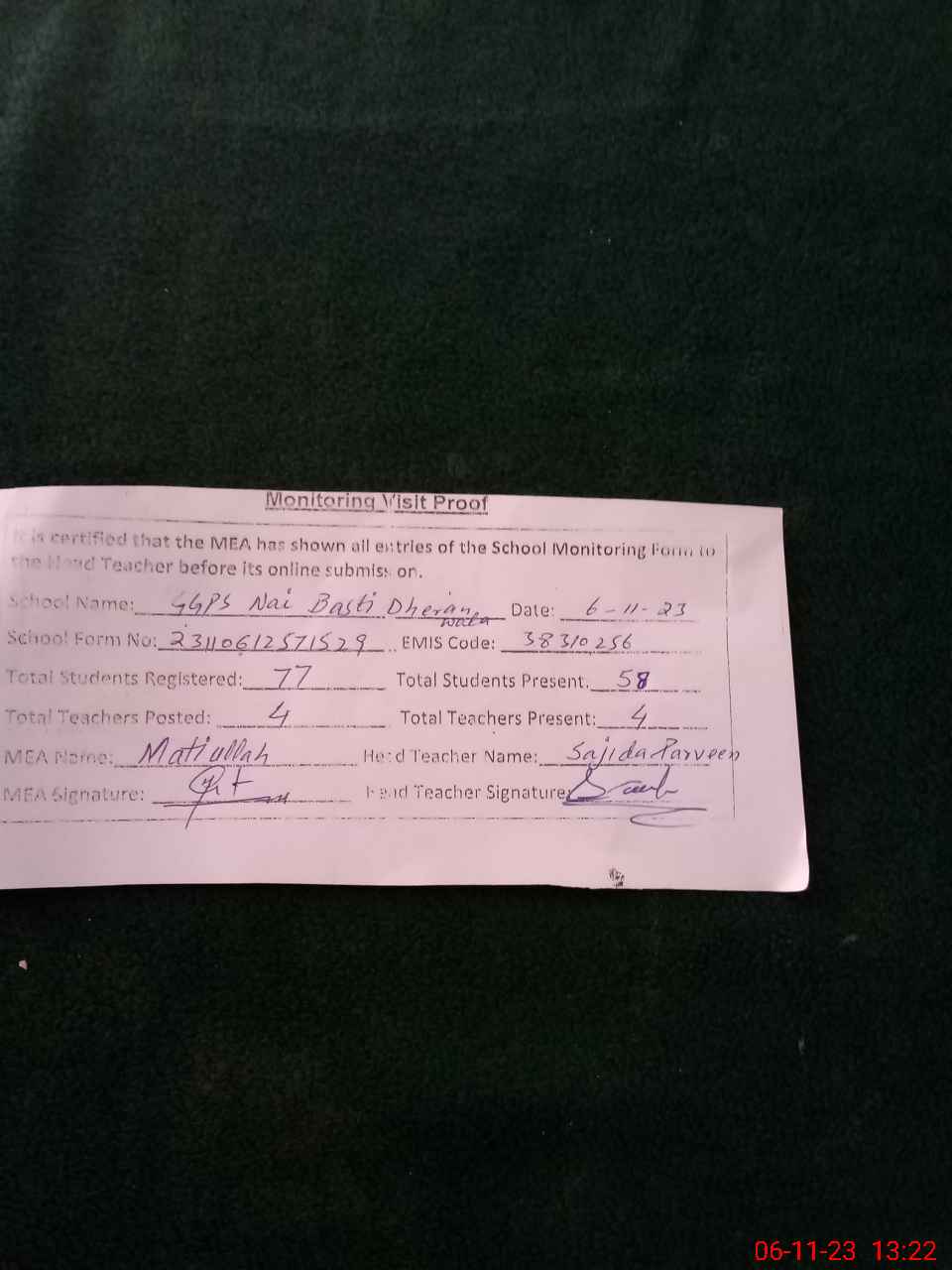 | Attendance Register | Head Teacher | MEA with School | Visit Proof |