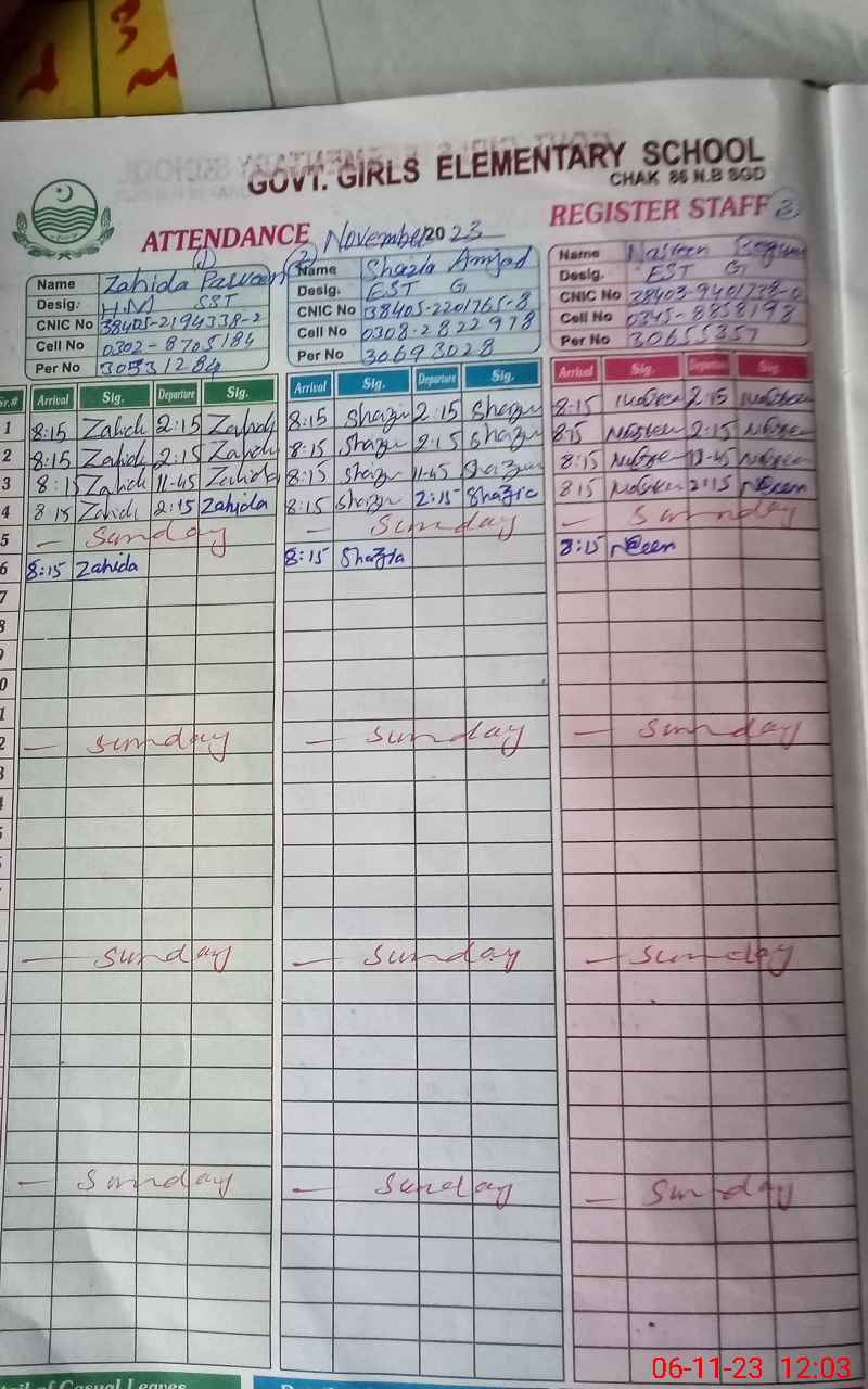 | CNIC | Full Name | Designation | R/C | Absence During Last Calender Month |