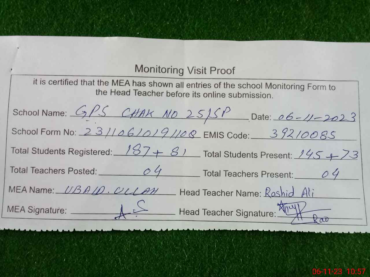 | Attendance Register | Head Teacher | MEA with School | Visit Proof |