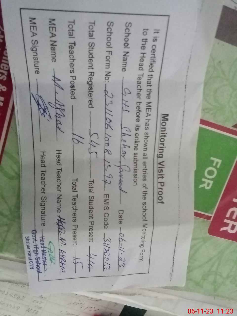 | EMIS Code: 31120013 | Name of School: GHS SHEHAR FARID | |||