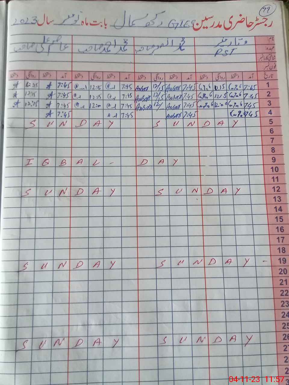 | CNIC | Full Name | Designation | R/C | Absence During Last Calender Month |