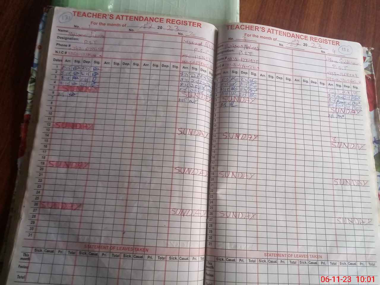 | CNIC | Full Name | Designation | R/C | Absence During Last Calender Month |