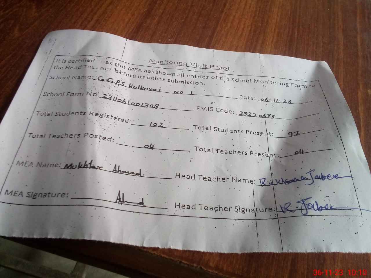 | Attendance Register | Head Teacher | MEA with School | Visit Proof |