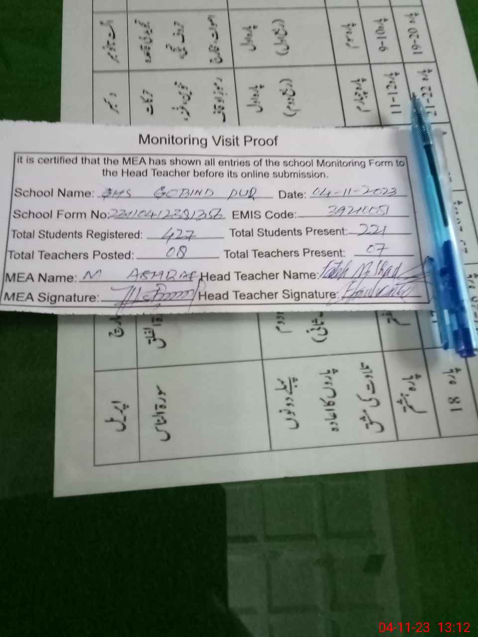 | Attendance Register | Head Teacher | MEA with School | Visit Proof |