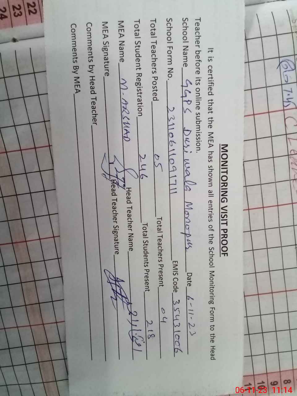 | Attendance Register | Head Teacher | MEA with School | Visit Proof |