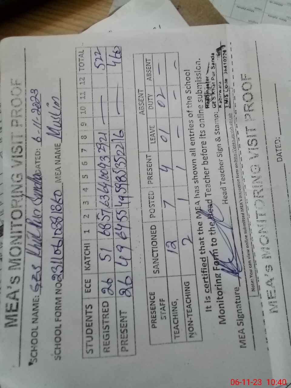 | Attendance Register | Head Teacher | MEA with School | Visit Proof |