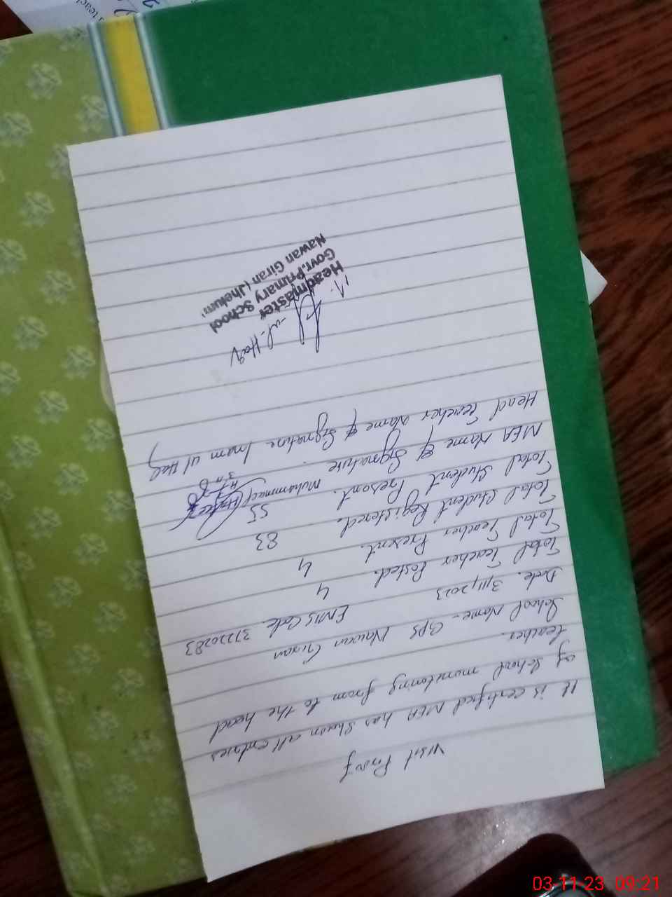 | Total no. of Classrooms: 4 No. of Classrooms Used for Teaching: 3 No. of Classrooms Storing Old Furniture, FTBs, etc: 0Comments if Any: Sir GPS Nawan Giran 37220283 PST Head Teacher Muhammad Inam ul Haq was late 45 minutes should be latecomer according instructions |