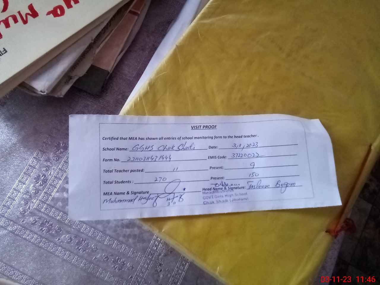 | EMIS Code: 37220022 | Name of School: GGHS CHAK SHADI | |||
