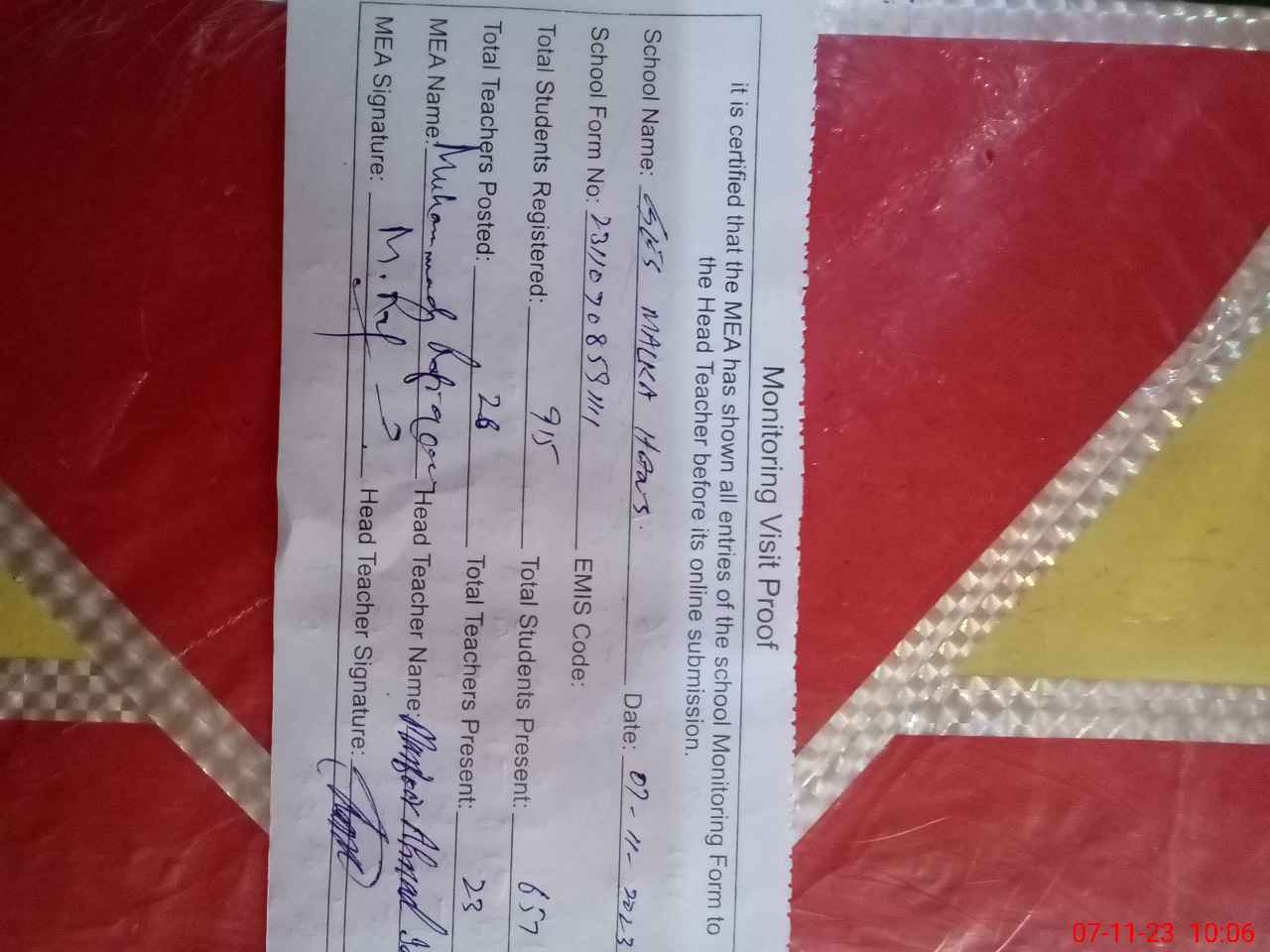 | Attendance Register | Head Teacher | MEA with School | Visit Proof |