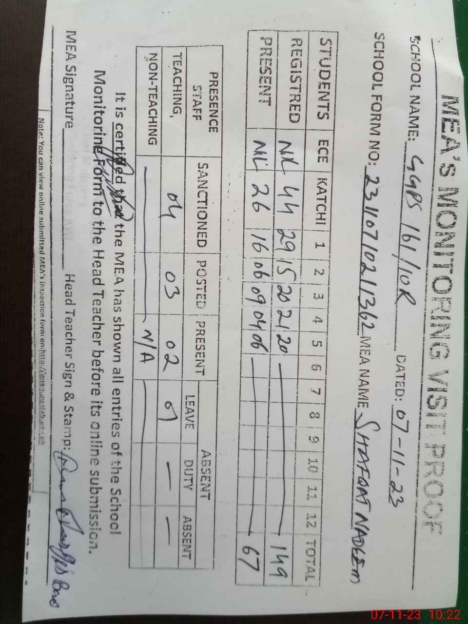 | Attendance Register | Head Teacher | MEA with School | Visit Proof |